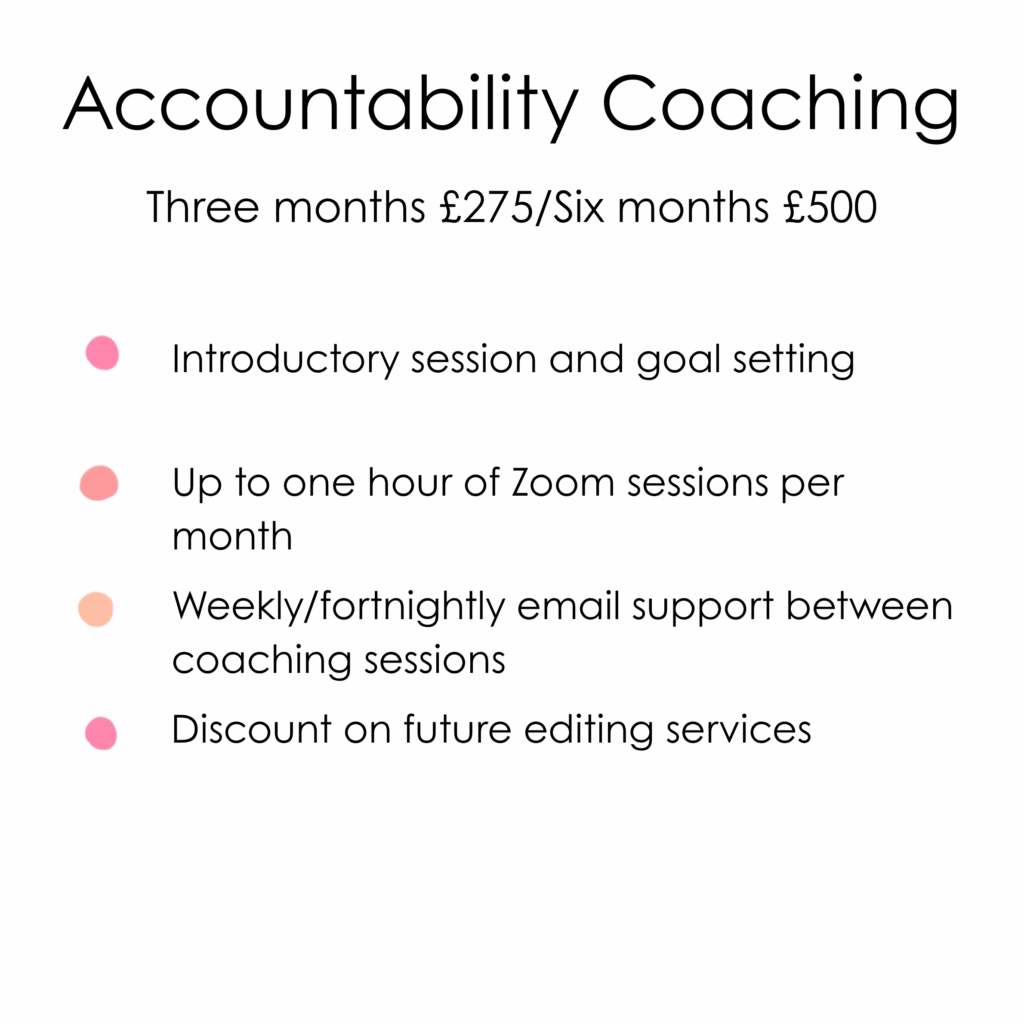 If you’re the eternal procrastinator, I see you! Designed to support authors at any stage of the writing journey, Accountability Coaching is a combination of coaching and cheerleading that will help you reach your writing goals – whatever they may be. We’ll have an introductory session where we set short, medium and long term goals. After that I’ll put together a bespoke plan that will fit into your lifestyle and other commitments, but ensure you’re able to achieve your writing goals at the same time.