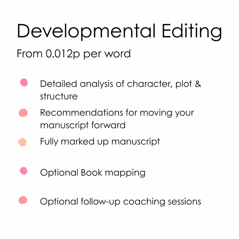 A developmental edit looks at your novel as a whole, focusing on the bigger picture elements of the story. This might include consideration of genre conventions and reader expectations, characterisation, character goals, motivations and conflict, narrative viewpoint, chapter and whole novel pace – but may include a whole host of other observations too. Traditionally, a developmental edit comes with a fully marked up manuscript and a letter of recommendation highlighting the strengths of your manuscript and key developmental issues that may need addressing. If you would like a more collaborative approach, developmental feedback can be delivered through one or more coaching sessions – the choice is yours!